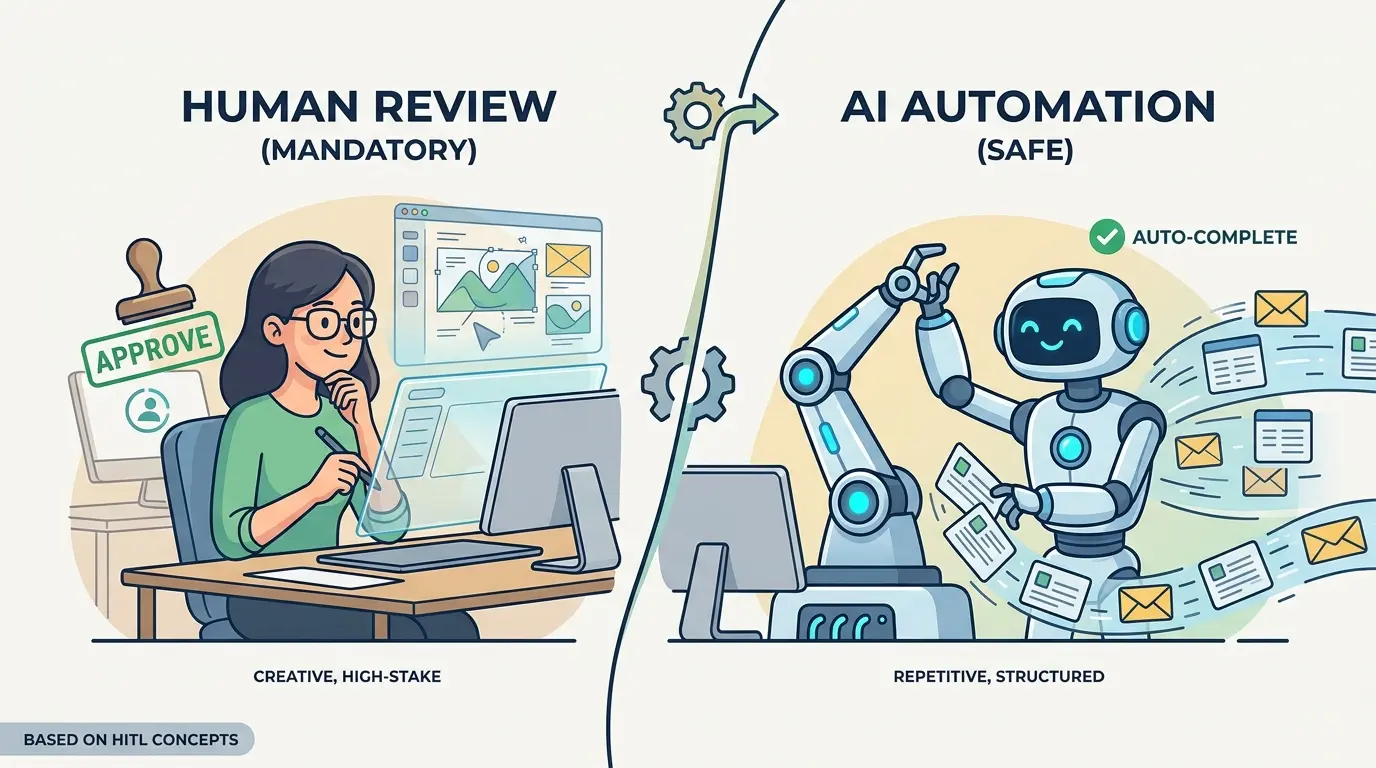 Before you automate anything, classify the work. Mandatory review usually applies when the output can change money, permissions, contracts, compliance posture, medical or legal meaning, or public claims. Safe automation usually applies when the task is reversible, narrow, well-scoped, and easy to audit.